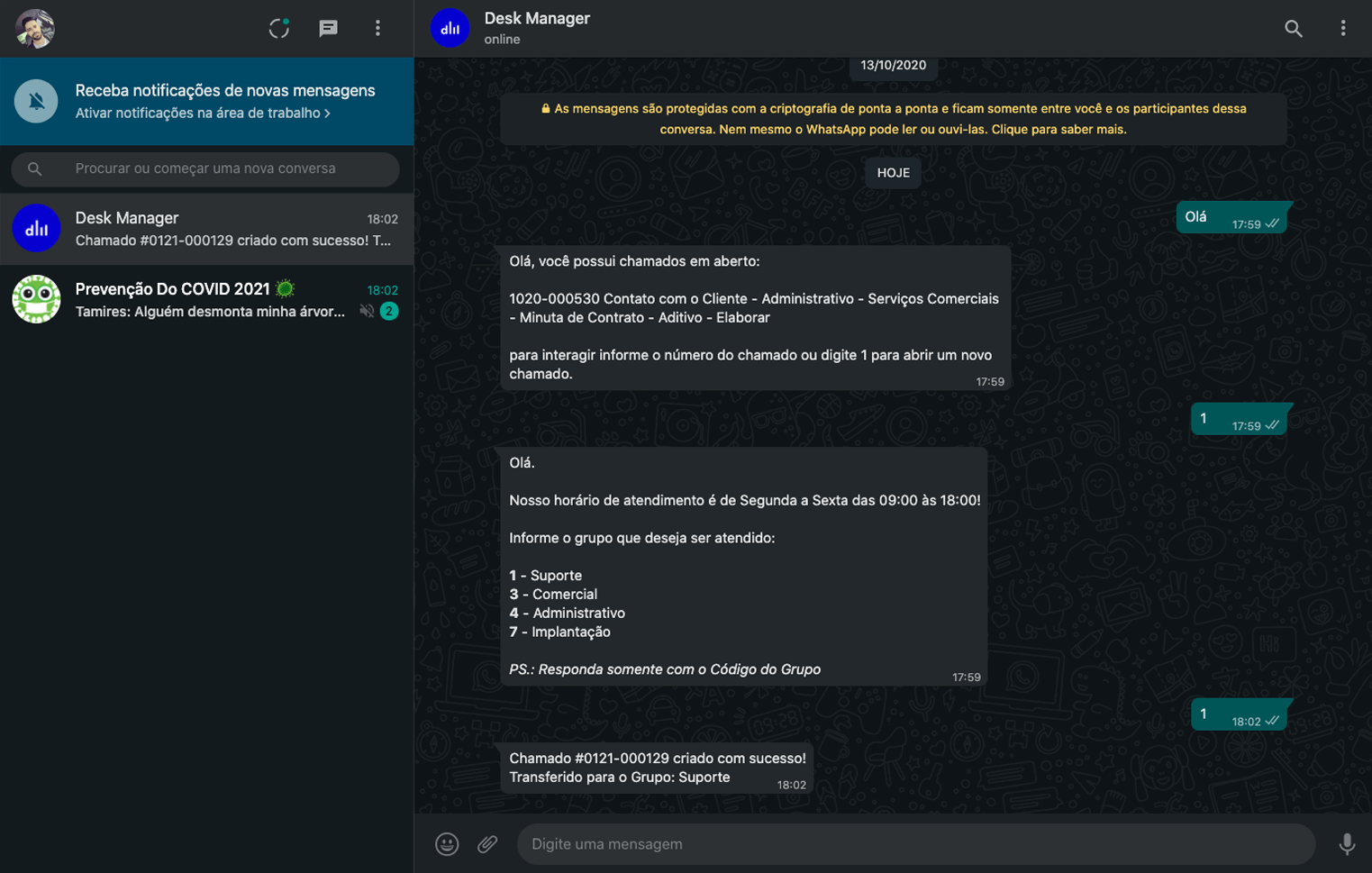 Esta é a funcionalidade principal e permite que o seu Solicitante entre em contato com a sua operação através do seu Número de Atendimento vinculado ao WhatsApp ou Telegram e ele ainda poderá escolher o Grupo de Atendimento com que deseja conversar, desta forma o atendimento será encaminhado para a fila correta, desde que esta fila tenha Operadores Online, além de já registrar um chamado automaticamente.