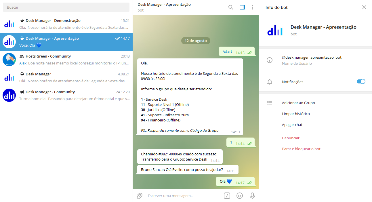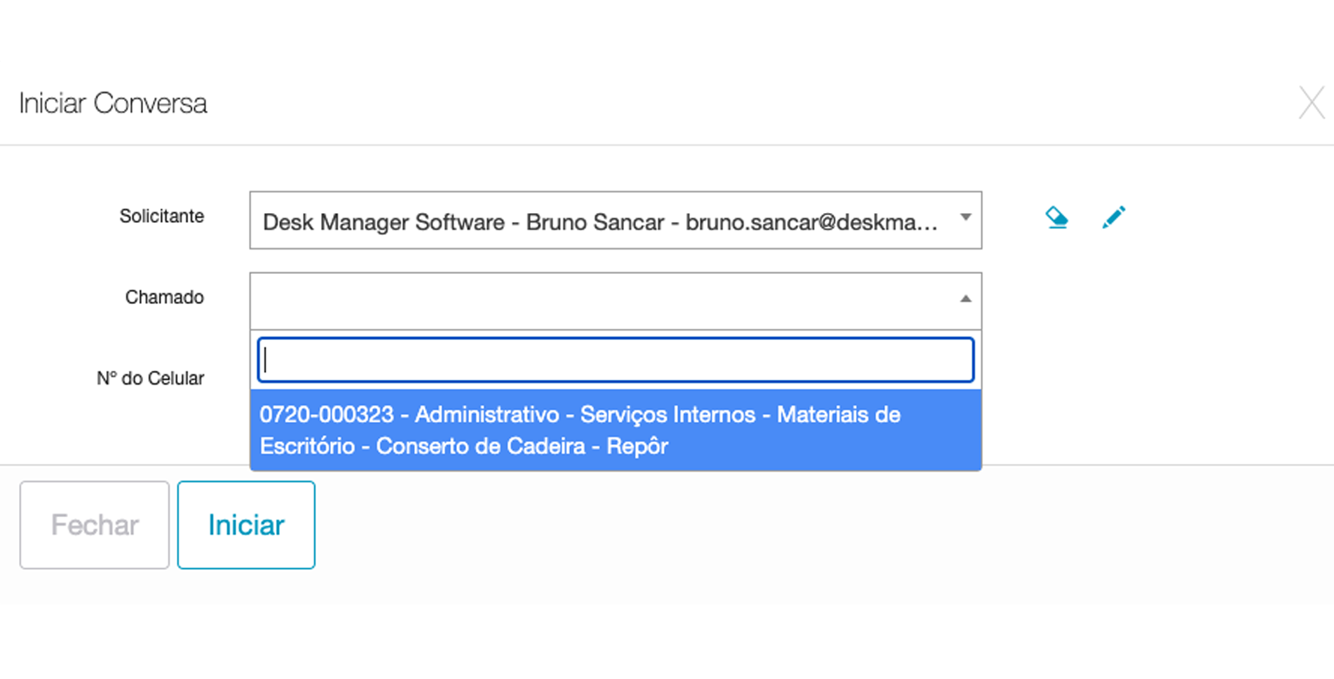 De forma proativa, a sua equipe pode iniciar uma conversa com o seu Solicitante no WhatsApp ou Telegram dele. Este atendimento ficará automaticamente documentado em um chamado.