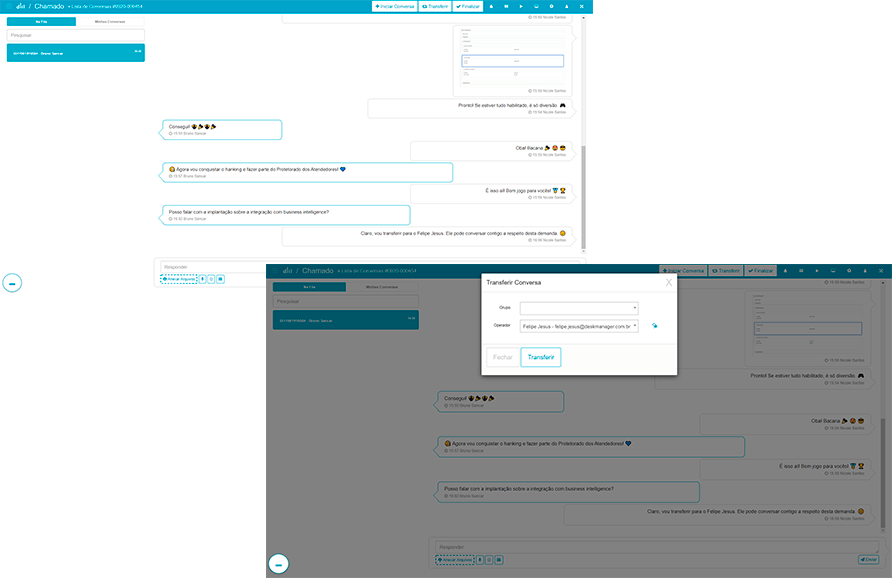 Visualize as Conversas através dos Chamados por Gestores (Administradores e Gerentes), e acompanhe o que está sendo discutido e até mesmo transfira o Atendimento quando necessário.