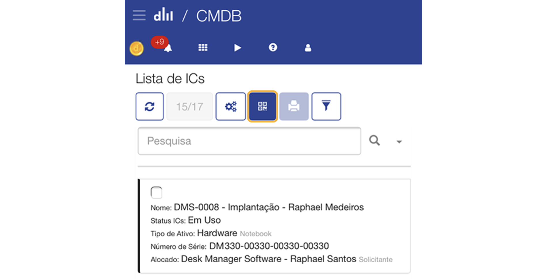 Desta forma, basta o operador acessar o Aplicativo do Desk Manager pelo celular, entrar no CMDB e escanear o QR Code da etiqueta do I.C. para consultar as informações cadastrais daquele equipamento