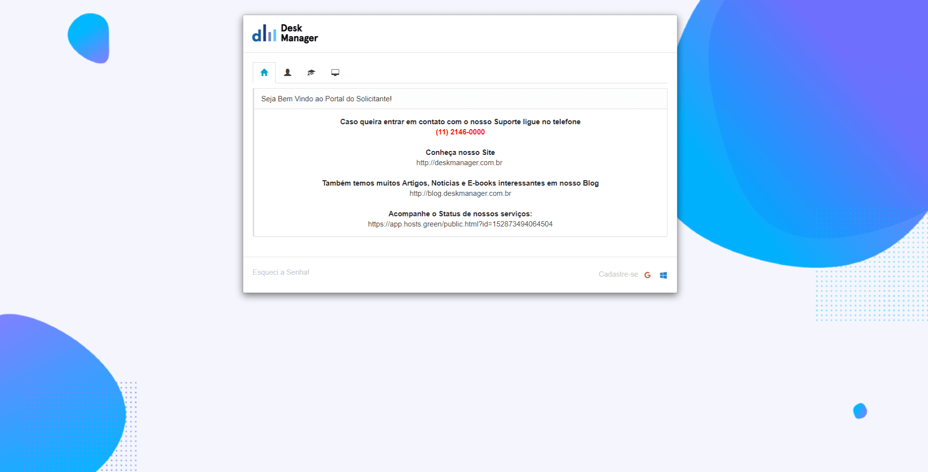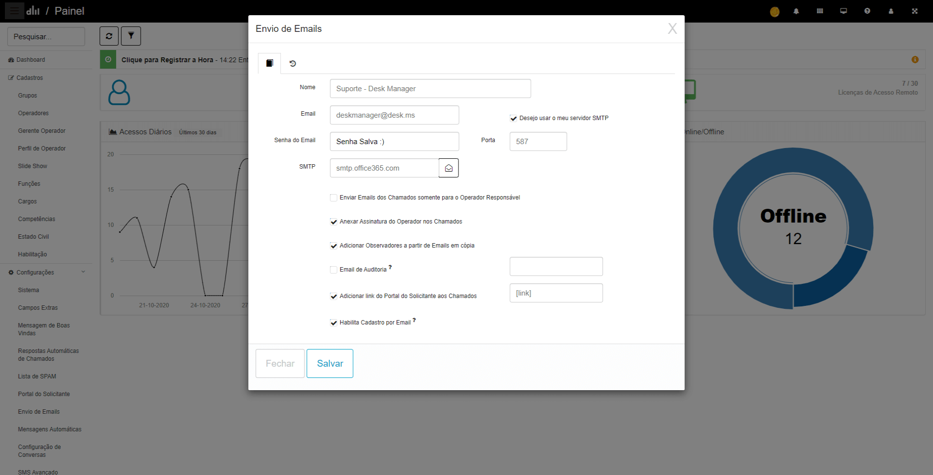 É possível configurar o login dos Operadores usando o método de integração por Active Directory (AD) para que não precisem decorar mais uma senha. Outra configuração importante que pode ser realizada pelo Aplicativo Painel é o serviço de e-mails, que será usado para disparo de todos os e-mails de chamados e alertas do Desk Manager.