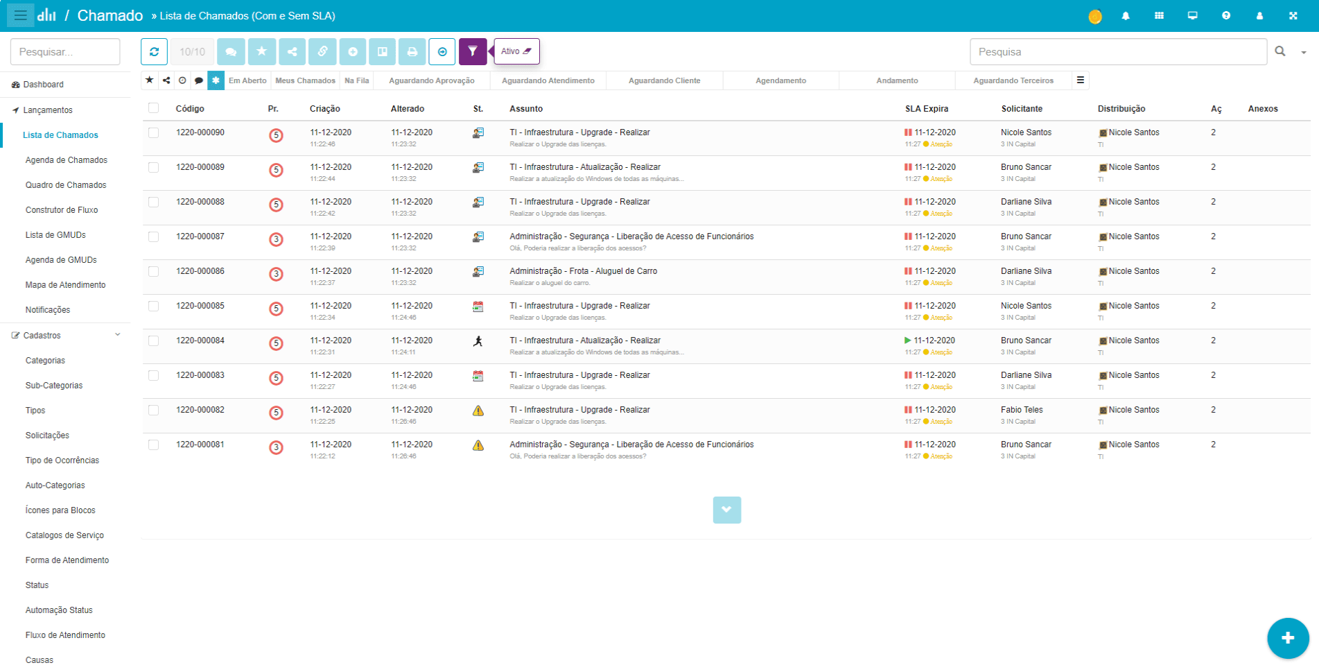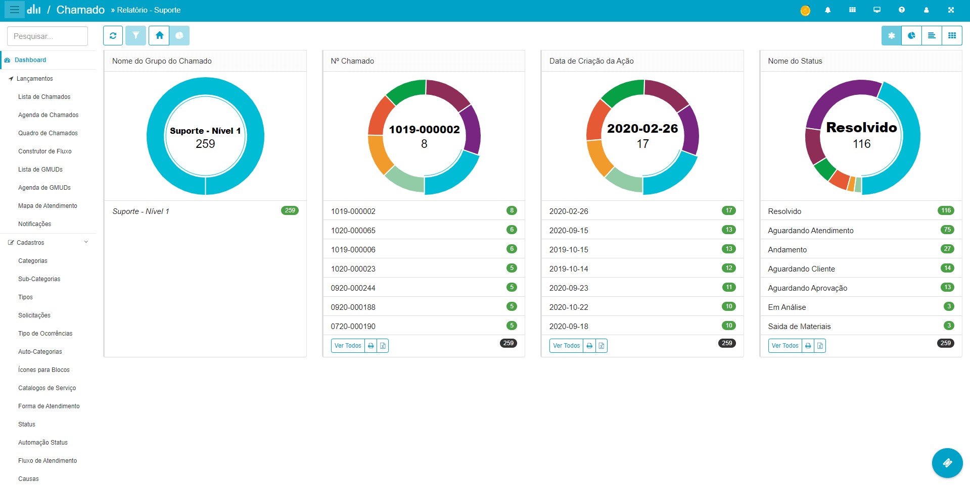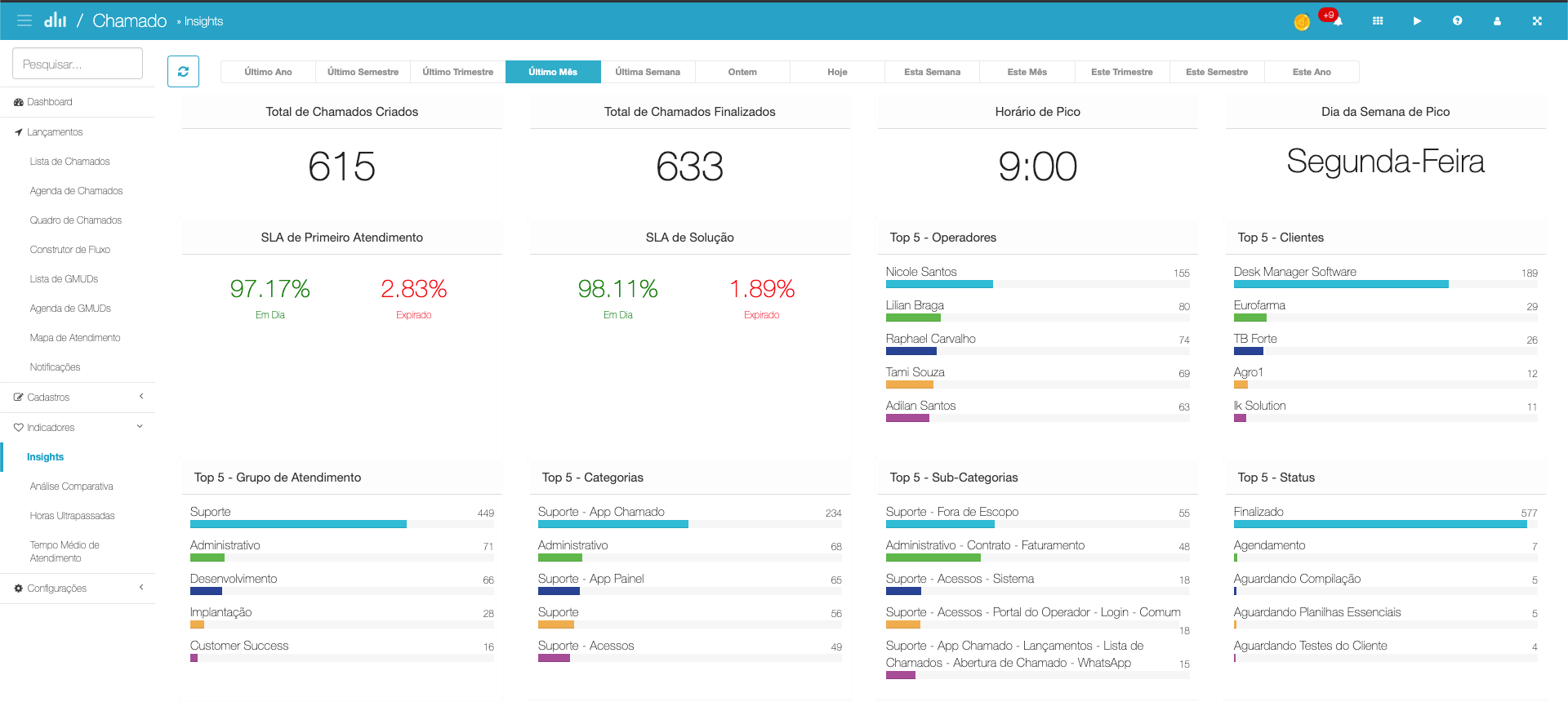 Com poucos cliques será fácil identificar quantos chamados cada membro da sua equipe está atuando, qual o cliente ou unidade de negócio possui mais demandas abertas com a sua operação, quantos chamados ainda estão com o SLA em dia ou expirando, e muito mais.