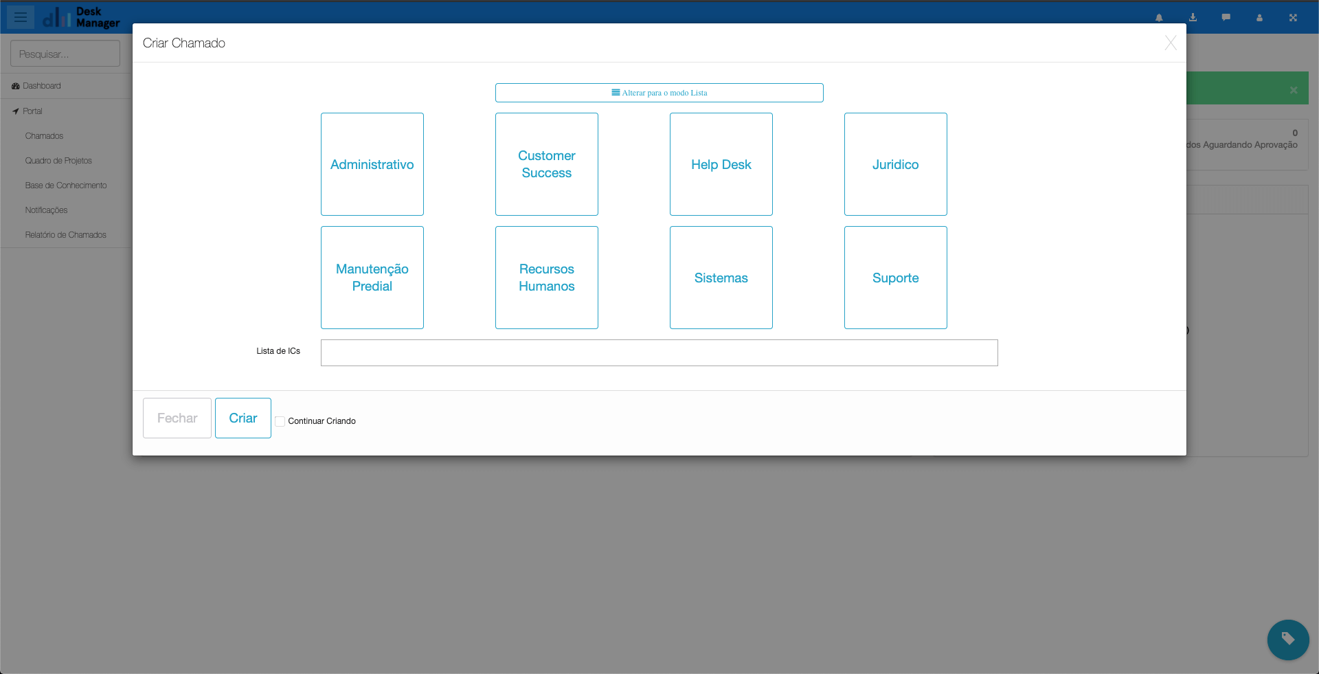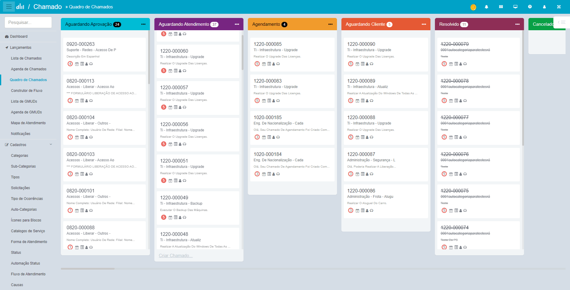 A visualização dos chamados pode ser trabalhada no formato de Lista ou de Quadro (Kanban), dessa forma o atendente pode operar usando o layout que preferir.