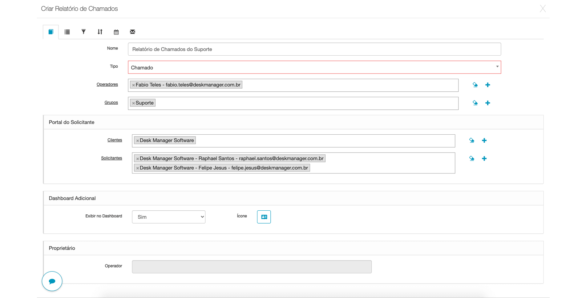 Criação de relatórios personalizados, escolha de informações para visualização e até mesmo condições que um chamado deve obedecer para ser listado no relatório.