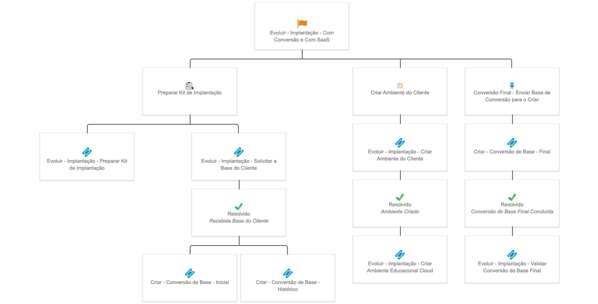 Por exemplo: É possível configurar para que um chamado de “Contratação de Novo Colaborador”, quando for finalizado, automaticamente crie dois outros chamados. Um de “Preparação de Equipamento Novo” e outro de “Liberação de Acessos”.