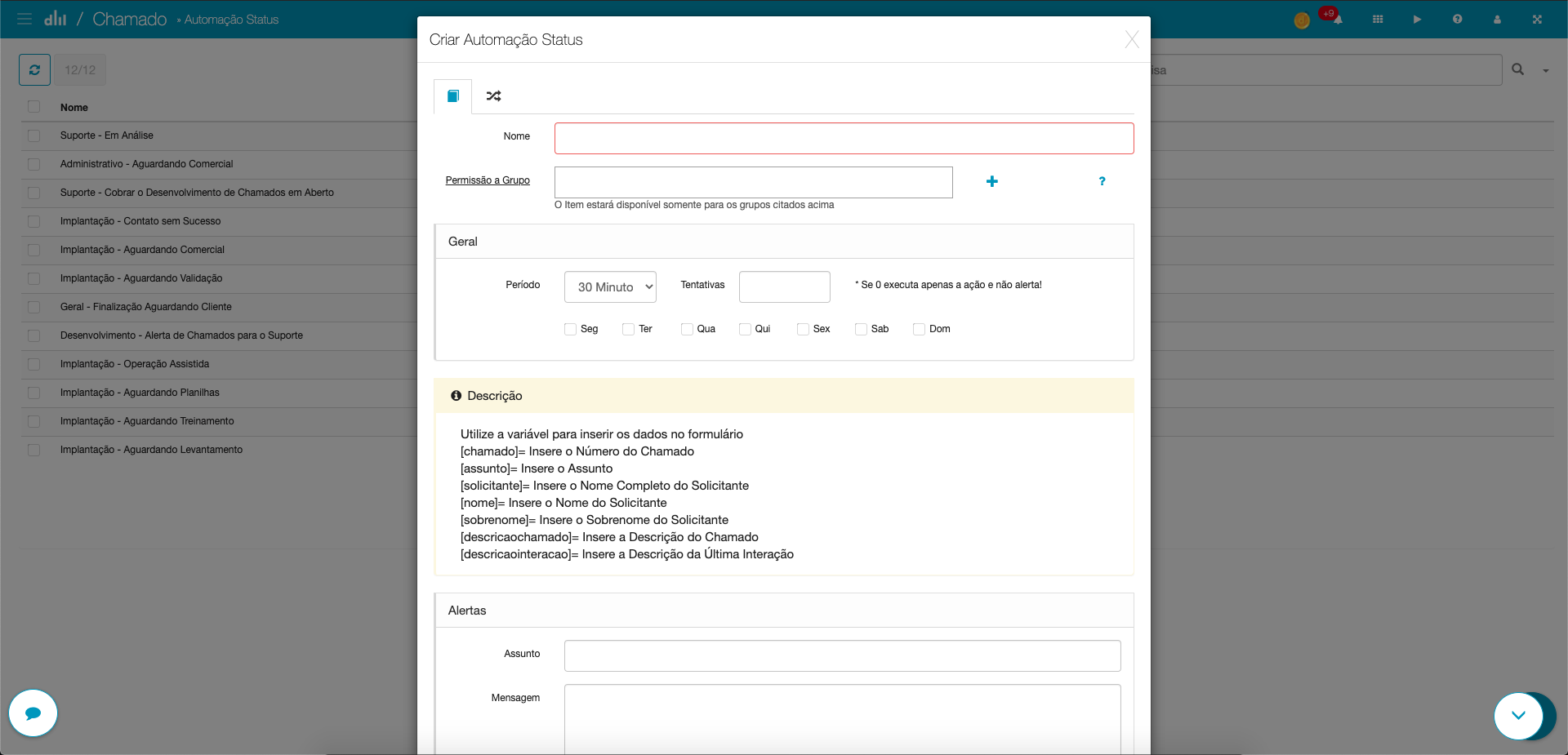Esta função permite criar regras de alertas automáticos ou até mesmo finalização automática de chamados que estão parados na fila da sua operação aguardando resposta do usuário há muito tempo.