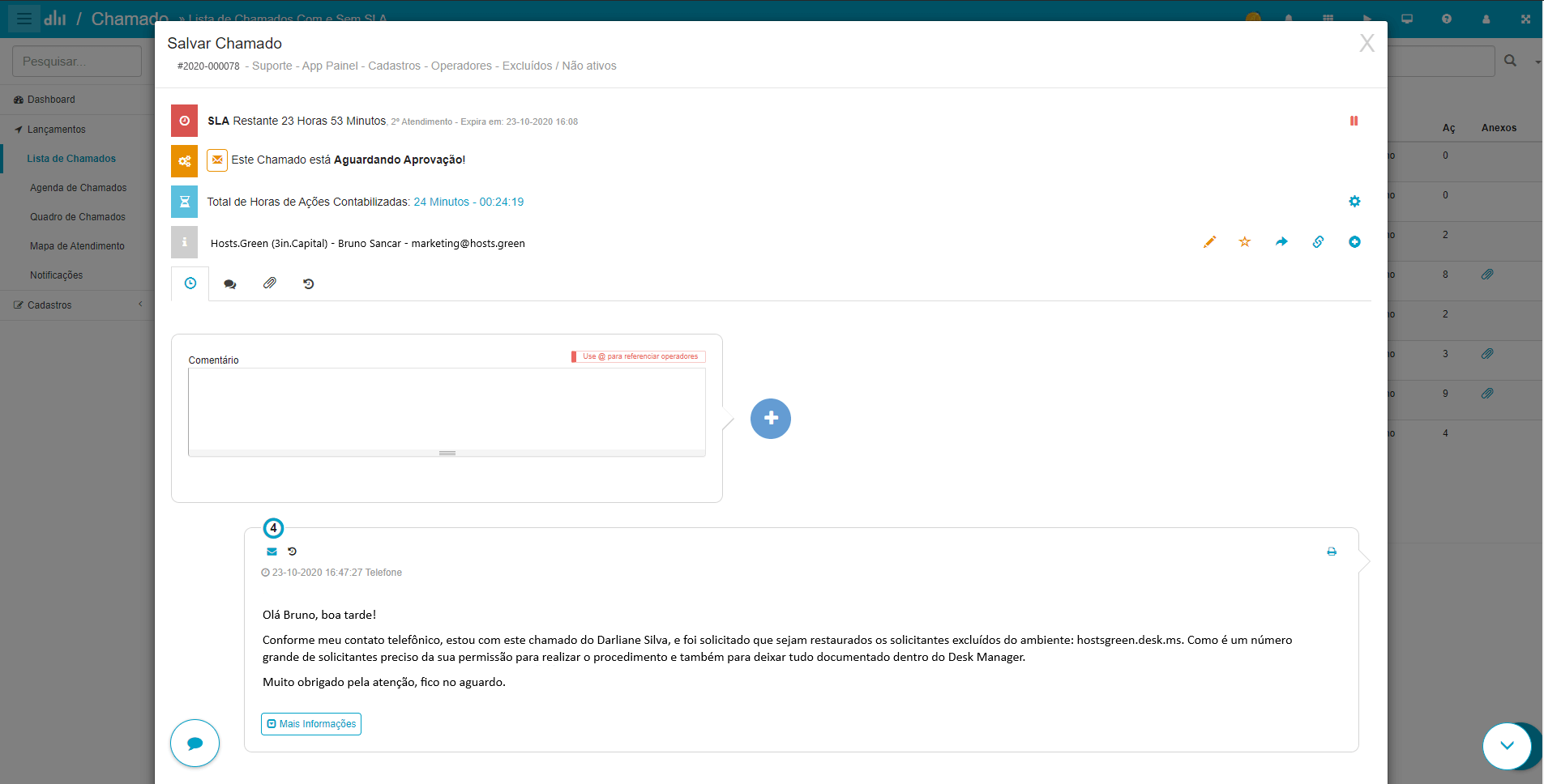 A parte importante é que a aprovação ou reprovação fica documentada dentro do chamado para uma possível auditoria e o chamado pode seguir um fluxo diferente para cada cenário, como ser liberado para atendimento após aprovado ou ser finalizado automaticamente em caso de reprovação.