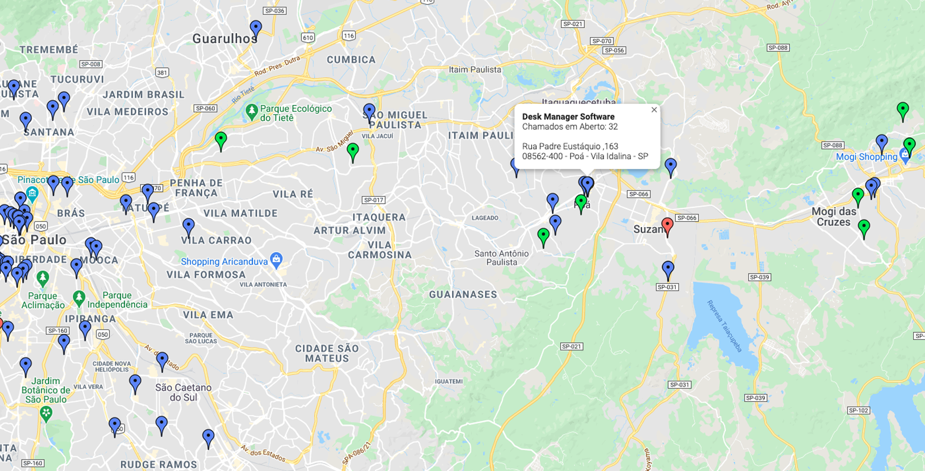 Aqui é possível visualizar um mapa geográfico da localização dos seus técnicos, coletada através do aplicativo mobile do Desk Manager. Um painel simples que pode ajudar muito a gestão do seu dia-a-dia.
